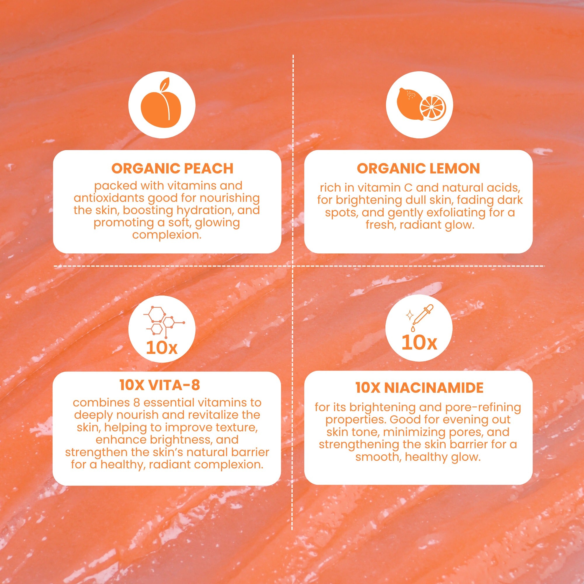 The formula is enhanced with Organic Peach and Lemon Extracts that help refresh dull skin and promote a healthy glow. With the added benefits of 10x VITA-8 and 10x Niacinamide, the scrub helps soothe the skin and improve overall skin brightness.