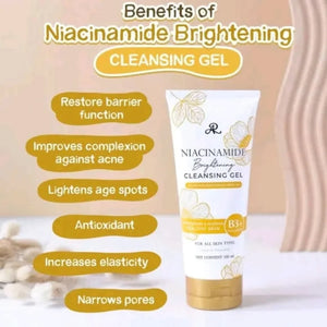 AR Niacinamide Brightening Cleansing Gel! This gentle cleanser is more than just your average face wash. It's packed with the power of Vitamin B3 (niacinamide), a superstar ingredient that works double duty. First, it whisks away impurities and excess oil, leaving your skin feeling squeaky clean but never stripped. Then, it gets to work on the inside, boosting your skin's natural radiance and hydration.