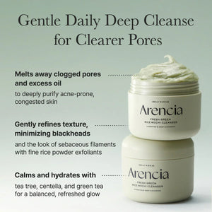 Arencia Fresh Green Rice Mochi Cleanser is a gentle exfoliating foaming cleanser crafted using an artisanal process that takes up to 170 hours to complete. Designed especially for oily, combination, and acne-prone skin, this cleanser effectively removes excess sebum, impurities, and blackheads while protecting the skin’s natural moisture barrier.