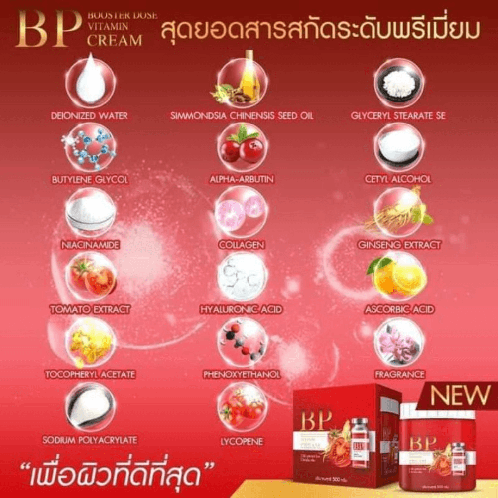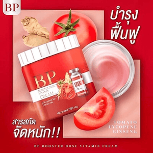Introducing Bp Booster Dose Vitamin Cream, a comprehensive skincare solution formulated to revitalize and nourish your skin. This potent cream is enriched with a powerful blend of ingredients, including alpha Arbutin, Niacinamide, collagen, Ginseng extract, Tomato extract, Hyaluronic Acid, Ascorbic acid, and Lycopene. With its unique formulation, this cream effectively targets various skin concerns while providing intense hydration and rejuvenation.