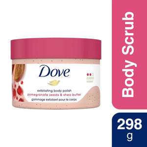 Dove Exfoliating Body Polish is specially designed to remove dry, dull skin and reveal a smoother, more radiant complexion. Enriched with exfoliating pomegranate seeds and nourishing shea butter, this luxurious body scrub gently buffs away dead skin cells while deeply moisturizing the skin.