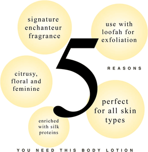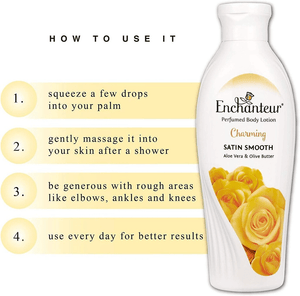 Enchanteur Charming Body Lotion contains exotic sensual fragrance of Rose, Muguet and soft Cedarwood that makes your skin soft and smooth. Enriched with Aloe Vera and Olive Butter, to give you Satin Smooth skin with optimum moisturisation and nourishment.