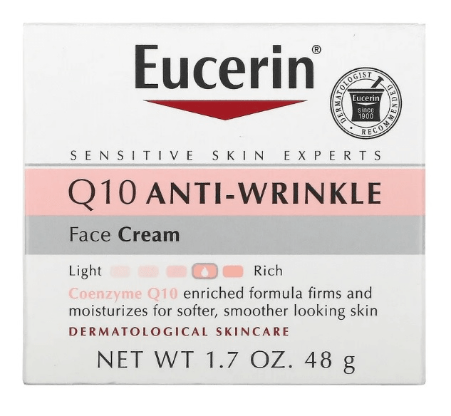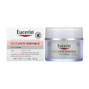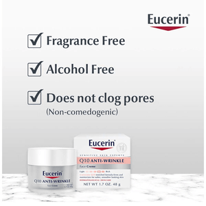 Eucerin Q10 Anti-Wrinkle Face Cream is an anti-wrinkle moisturizing cream made for dry, sensitive skin. It is specially formulated to be non-irritating and to gently reduce the look of wrinkles and the signs of aging.