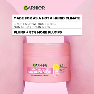 Meet the Garnier Niacinamide Mochi Dry Touch Cream — a lightweight, oil-free moisturizer formulated to hydrate, smooth, and support plumper-looking skin with a comfortable, shine-free finish.