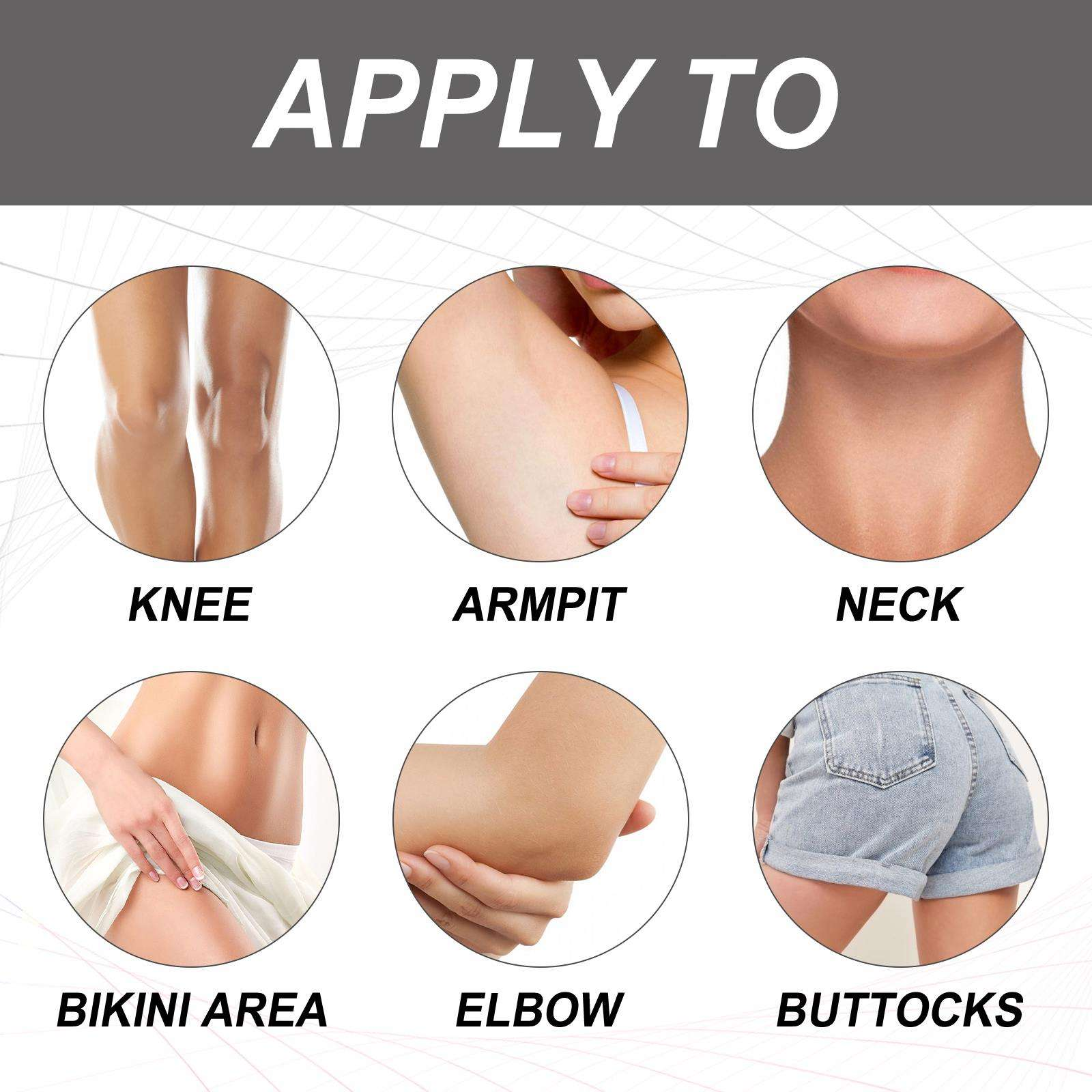 This cream is commonly used on areas such as the underarms, knees, elbows, buttocks, and bikini line (external skin only).