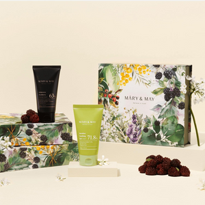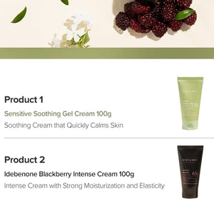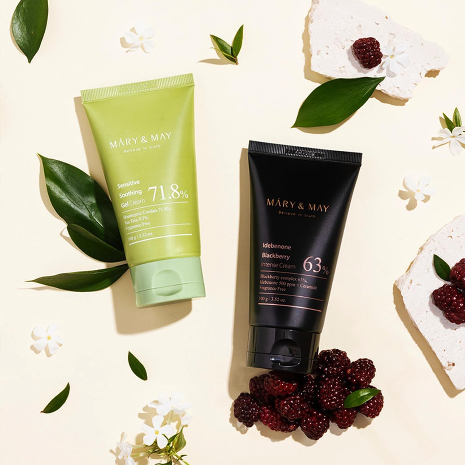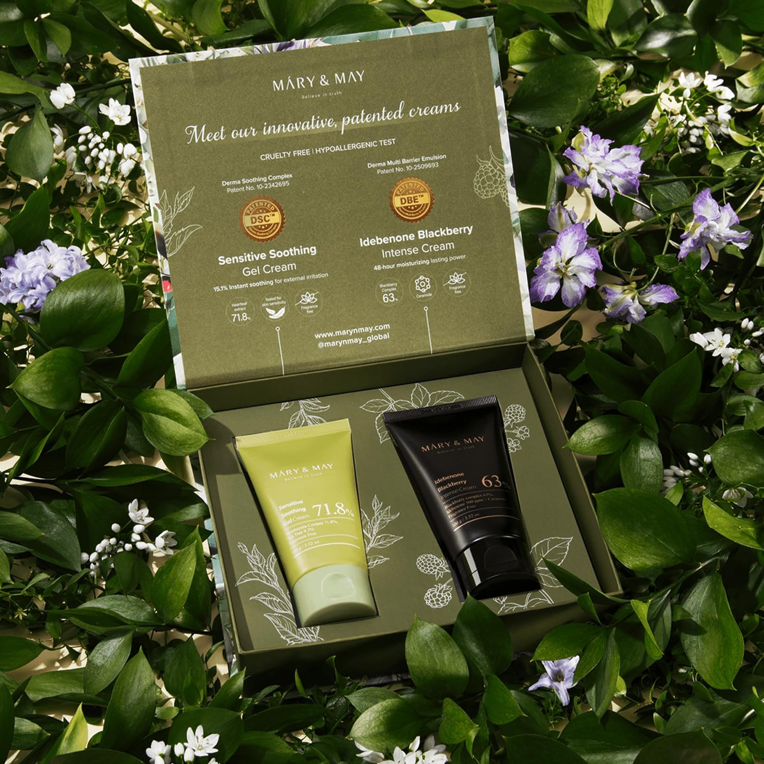 Experience the perfect skincare pairing with the Mary&May best-selling duo set. This combination of Sensitive Soothing Gel Cream and Idebenone Blackberry Intense Cream is designed to calm irritated skin while delivering antioxidant-rich hydration and firming care.