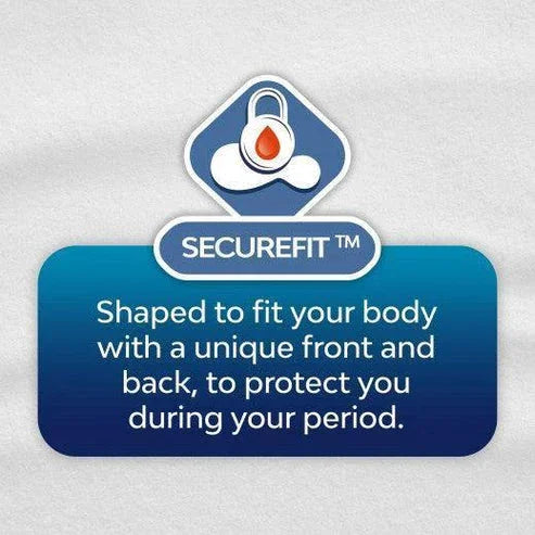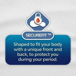 • Shaped to fit your body with a unique front and back, to protect you during your period.
