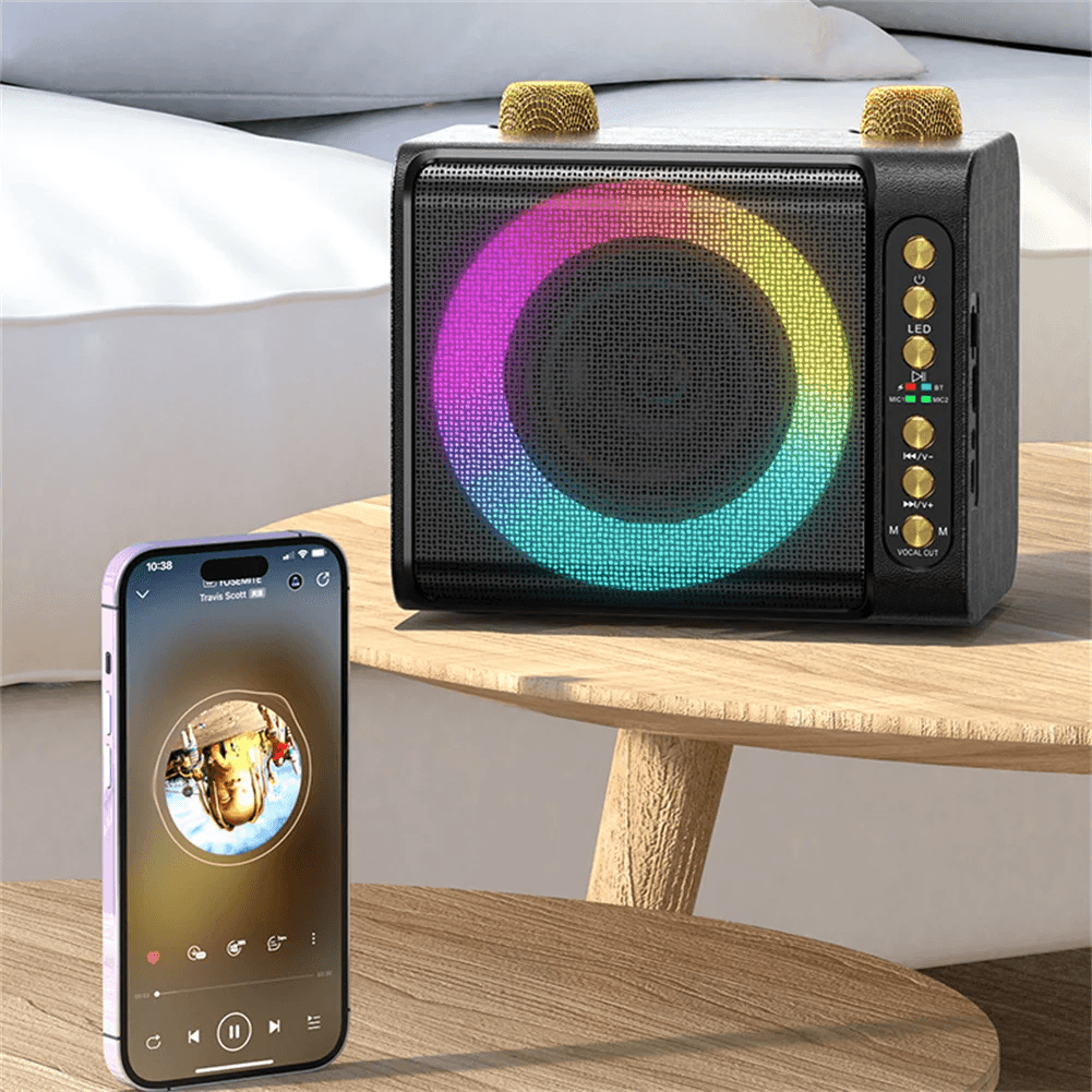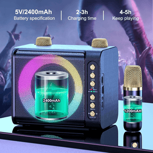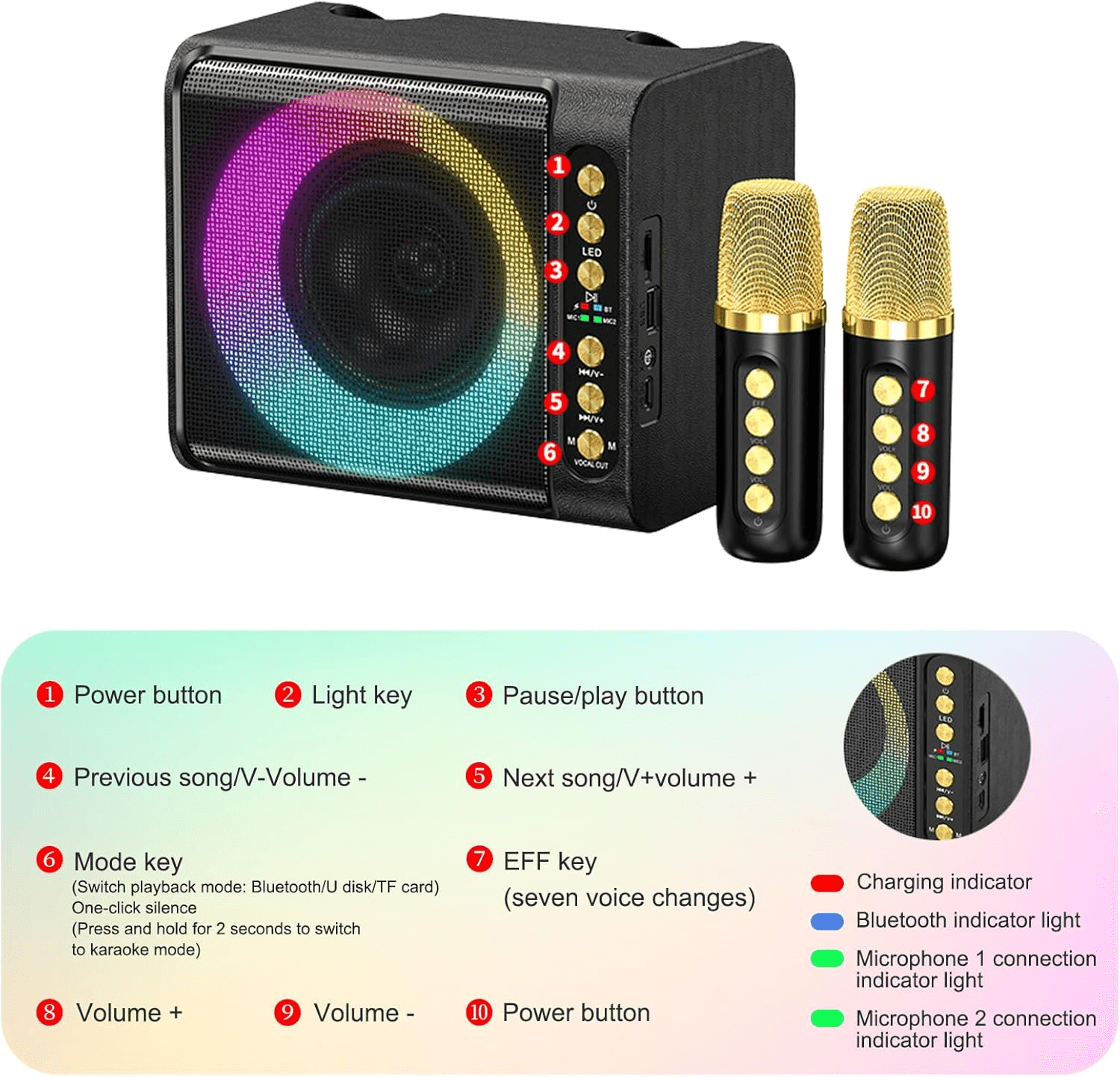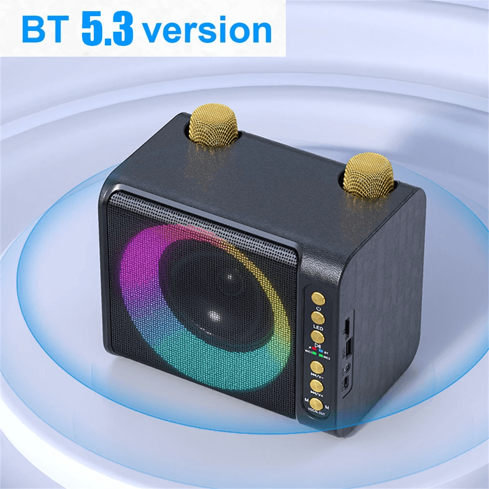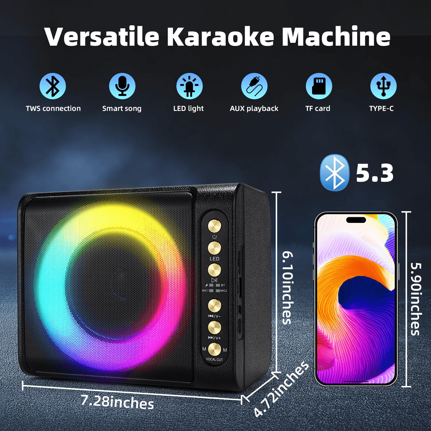 • Bluetooth 5.3 Configuration: The portable karaoke machine with 2 wireless microphones that automatically pair with the karaoke machine when turned on, with a coverage area of approximately 66 fee t(≥20m). It supports Micro TF cards, Flash USB, AUX in and TV connections, and is compatible with Android phones, iPhones, iPads, TV, and PC. Our Bluetooth karaoke speakers have built-in Bluetooth 5.3 for superior wireless connectivity, higher efficiency, and lower latency.