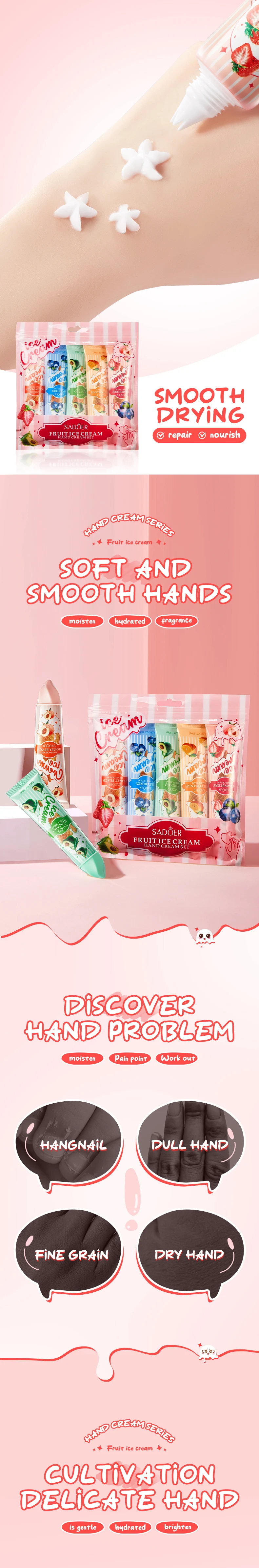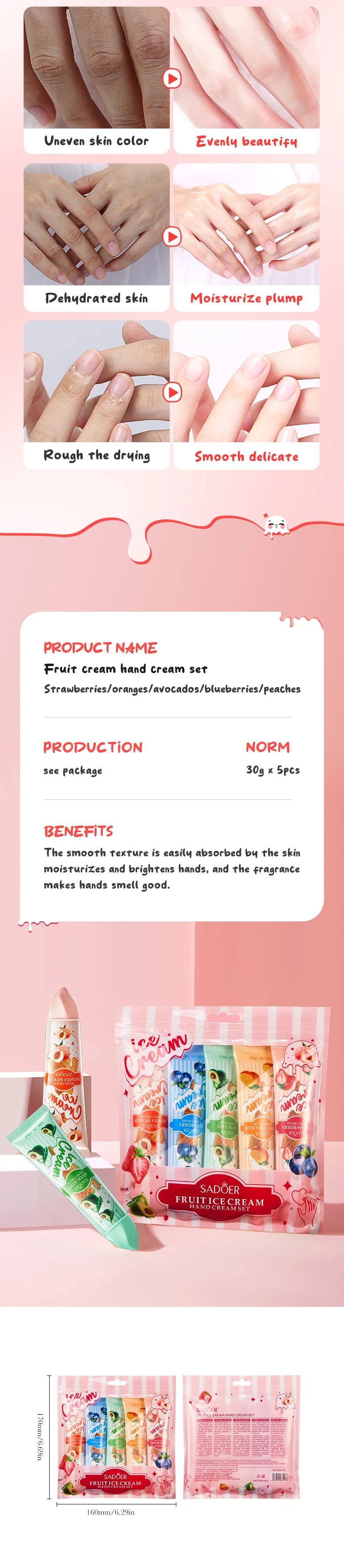 SADOER 5-Piece Fruit Ice Cream Hand Cream Set is the perfect treat for dry hands, combining moisturizing, nourishing, and brightening care with adorable fruit ice cream–inspired designs. Each hand cream leaves your skin soft, supple, and delightfully scented—making every application feel refreshing and indulgent.