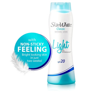 SkinWhite Light-Feel Technology SPF 20 is SkinWhite's well-loved classic variant that makes skin visibly lighter WITHOUT the sticky feeling! It is infused with Vitanourish Formula (Vitamins B3, B5, B6, C, & E) that moisturizes and softens the skin, and SPF 20 helps protect against harmful sun rays.