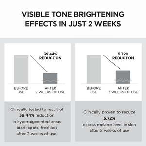- Active ingredients create a synergic effect of tone brightening and skin barrier repair