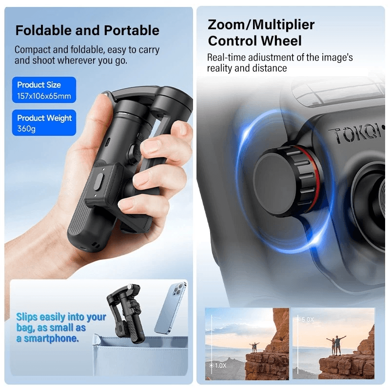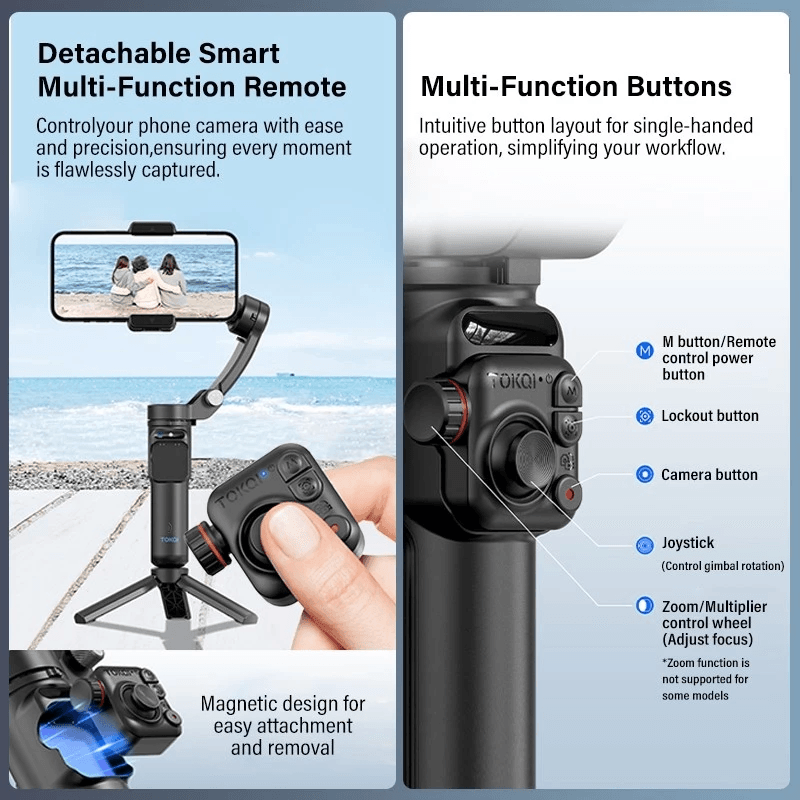 - TOKQI M02 3-Axis Handheld Gimbal Stabilizer for iPhone and Android Phones, Magnetic Detachable Remote Control, Selfie Tripod, Reduces Shake When Recording TikTok Videos and Vlogs