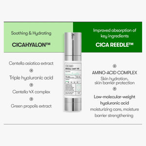 VT Cica Reedle Shot 100 Essence features 95,000 micro Cica Reedles, designed to penetrate deep into the skin for targeted care. These microneedles, smaller than pores, deliver active ingredients like Centella Asiatica Extract and small-molecule Hyaluronic Acid directly to the skin, boosting absorption and enhancing results. Perfect for sensitive skin, it moisturizes, protects, and revitalizes while providing gentle stimulation for optimal efficacy.