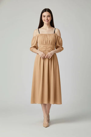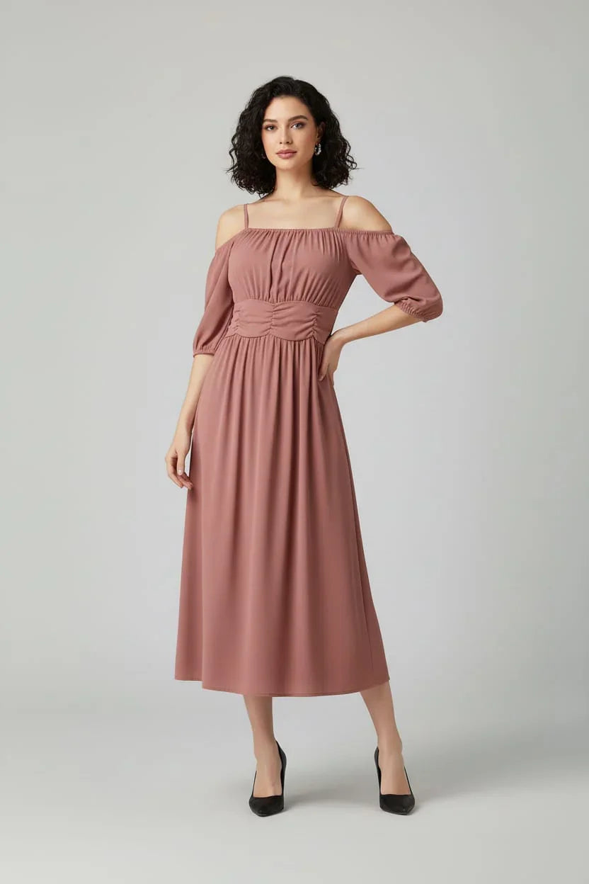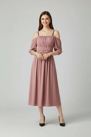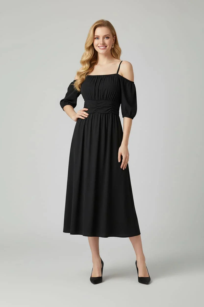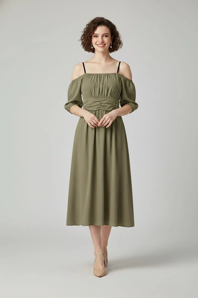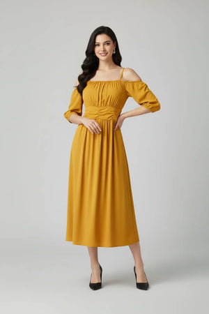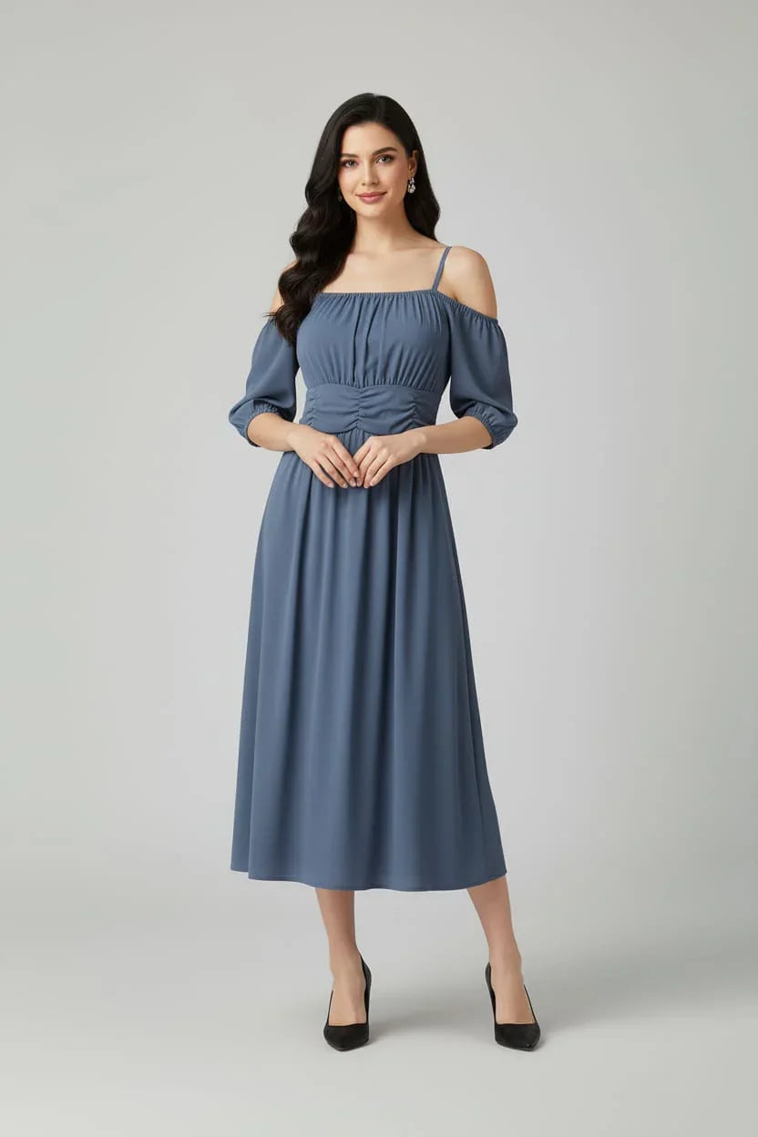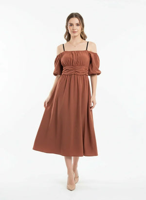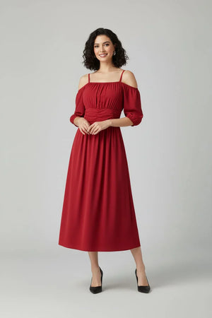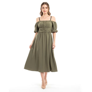 Women's Off-Shoulder Midi Dress with Puff Sleeves